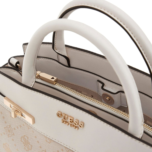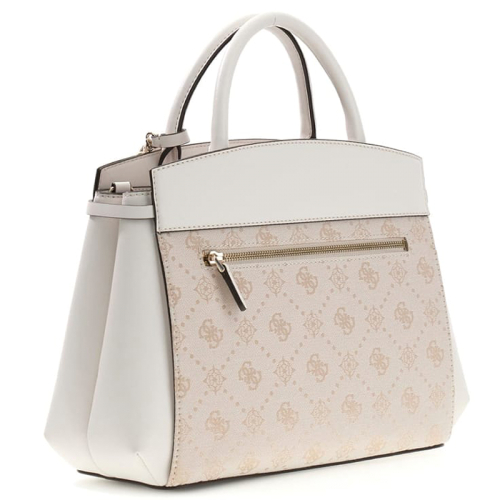 De Guess Melinda Logo handtas is een stijlvolle eyecatcher. Het ontwerp combineert wit met ecru stof op de voor- en achterkant, waarop het Guess-logo subtiel in een donkere tint is aangebracht. De goudkleurige hardware geeft de tas een luxe uitstraling en maakt het geheel elegant af.