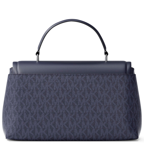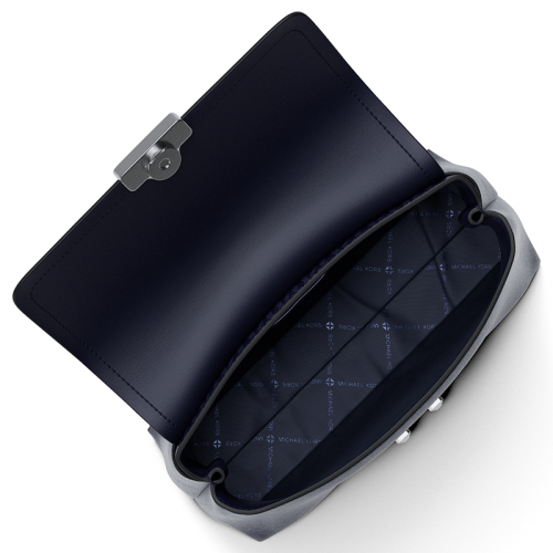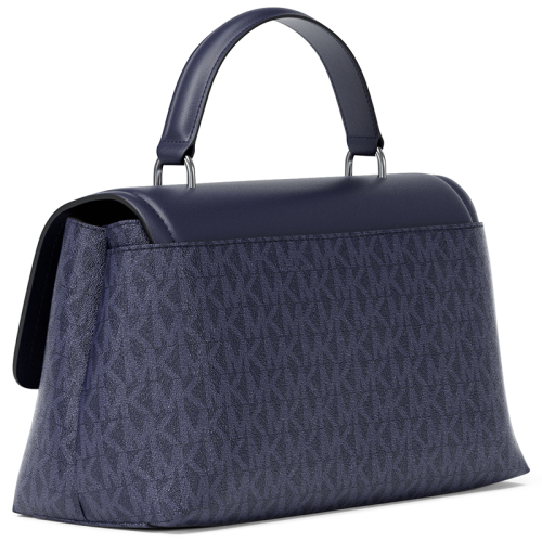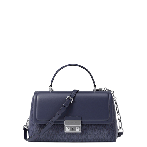 De Michael Kors Tribeca is een stijlvolle handtas van leer, afgewerkt met zilverkleurige hardware. Het ontwerp wordt gekenmerkt door een all-over logo in een lichtere blauwtint, wat de tas een moderne uitstraling geeft. De klep vormt een subtiel contrast doordat deze volledig in blauw is uitgevoerd, wat zorgt voor een elegante balans.