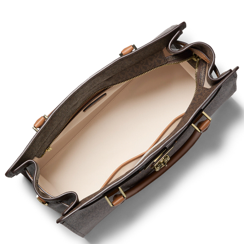 Zin in een vleugje luxe? De Michael Kors Hamilton Moderne handtas is een stijlvolle update van een iconisch model. Gemaakt voor liefhebbers die houden van een beetje lef, komt deze tas met een stoere, goudkleurige hardware die je look een flinke dosis verfijning geeft. De Signature-logoprint maakt het helemaal af, waardoor deze tas een echte eyecatcher is. Het charmante hangslotje en de buckle maken het plaatje compleet. Draag hem nonchalant aan de handvatten of ga voor de handsfree optie met de verstelbare crossbodyband.