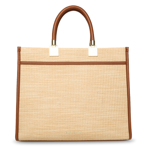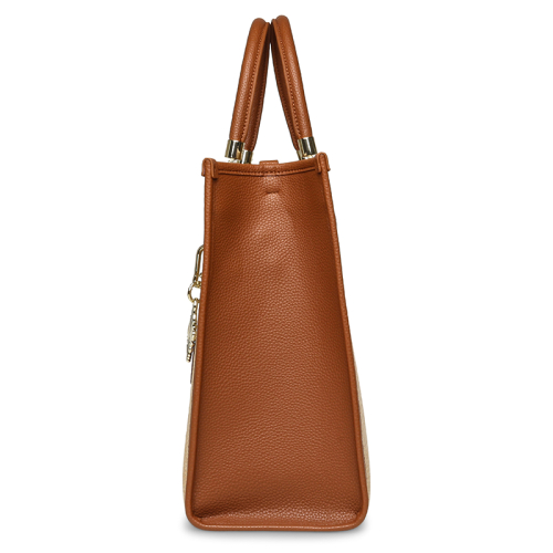 De Steve Madden BliteC is een ruime beige strandtas met goudkleurige hardware en een stijlvolle bag charm aan de voorkant. De lichte tint en het speelse design maken het de perfecte tas voor zonnige dagen.