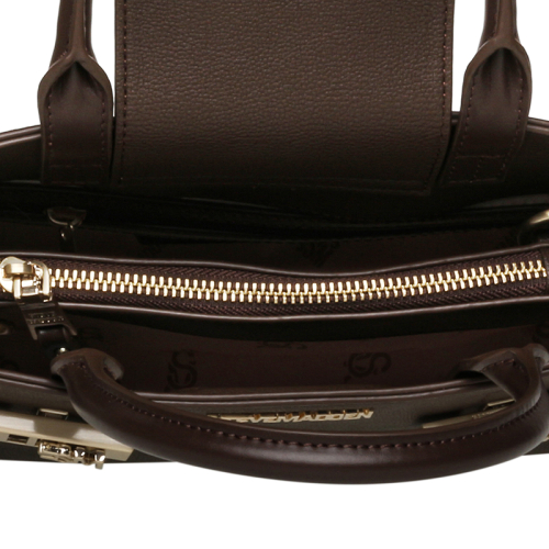 De Steve Madden Blindie in het bruin is een elegante handtas met een krachtige uitstraling. De goudkleurige hardware voegt een vleugje glamour toe, terwijl de stevige steunpootjes zorgen voor stabiliteit en een luxe afwerking. Een subtiel strookje van zwart imitatieleer verbindt de voor- en achterkant via een goudkleurige S en M. Een slimme en stijlvolle manier om de tas compacter te maken of juist extra ruimte te creëren.