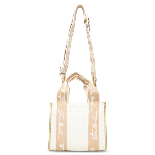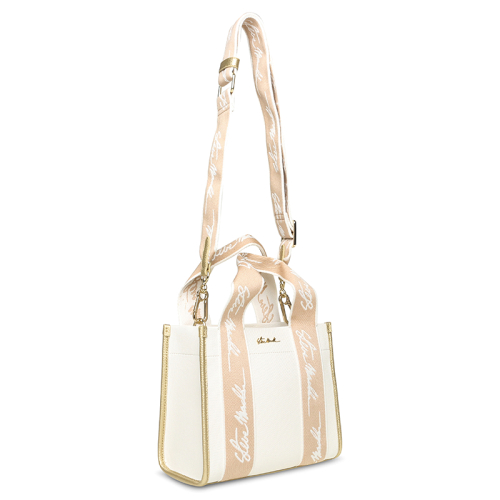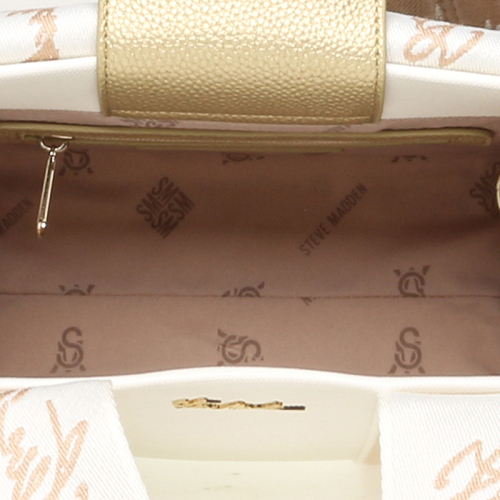 De Steve Madden Btidal is een stijlvolle witte handtas met beige en gouden details en goudkleurige hardware. Het subtiel geëmbossede logo op de voorkant geeft de tas een moderne, luxe uitstraling.