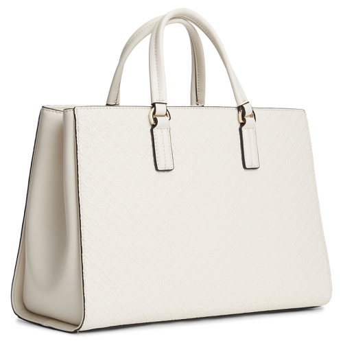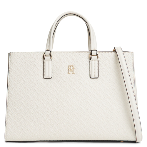 De stijlvolle TH Daily handtas van Tommy Hilfiger straalt moderne elegantie uit dankzij het strakke beige design met subtiel debossed logopatroon en donkere contrasterende lijnen. Een verfijnde tas die moeiteloos klasse en functionaliteit combineert voor elke gelegenheid.