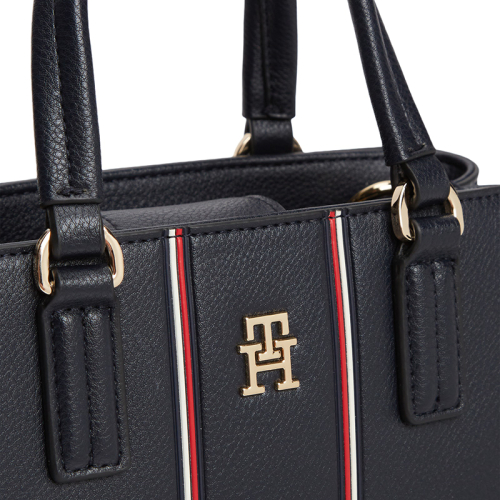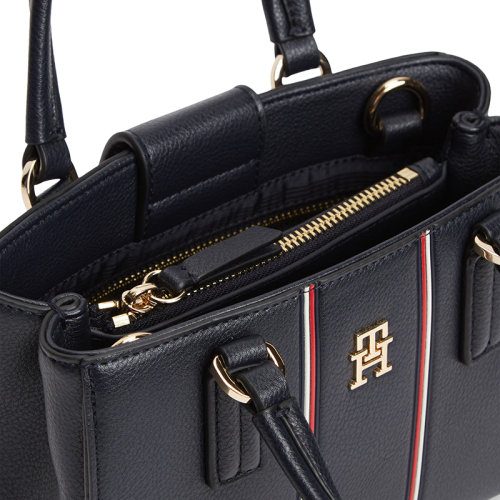 Een echte blikvanger, dat is de Tommy Hilfiger TH Daily handtas. Deze stijlvolle tas komt in de iconische blauw kleur, verfraaid met witte en rode strepen die de klassieke Tommy Hilfiger look benadrukken. Het merklogo in chic goudkleurig metaal op de voorkant straalt pure klasse uit. Het Amerikaanse merk Tommy Hilfiger staat al jaren synoniem voor casual luxe en preppy stijl, en deze tas is hier een perfect voorbeeld van. Compact, elegant en met een klassieke uitstraling die je meteen herkent, is deze tas een must-have voor elke modebewuste vrouw.