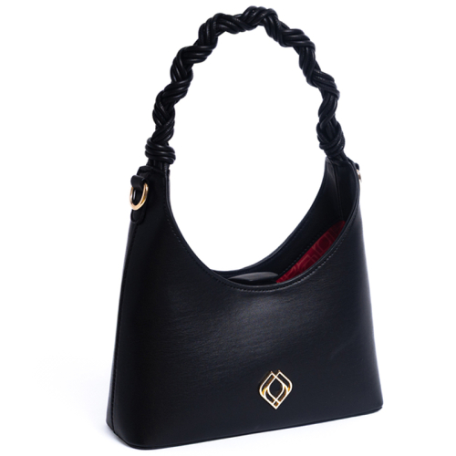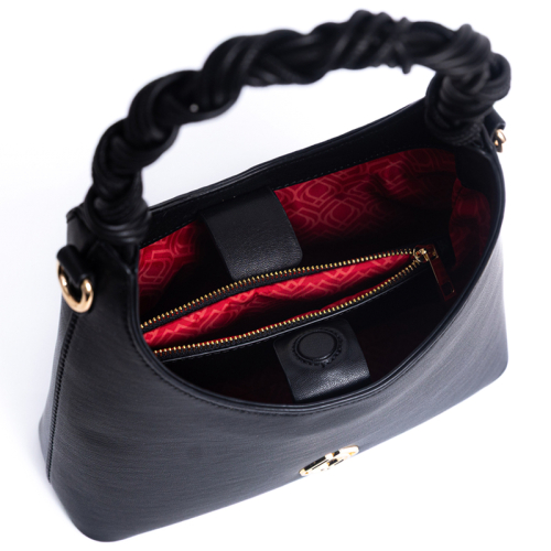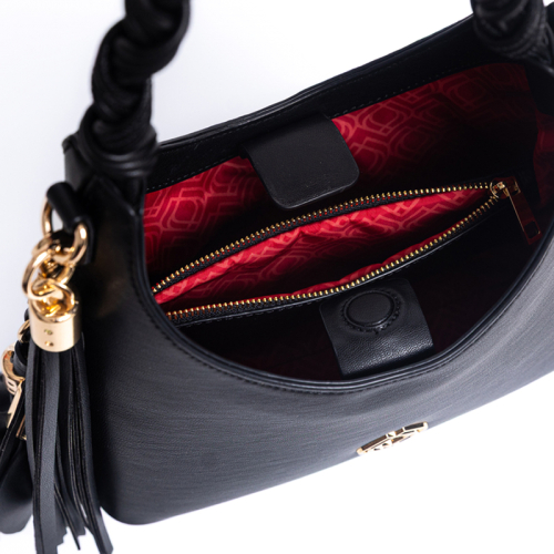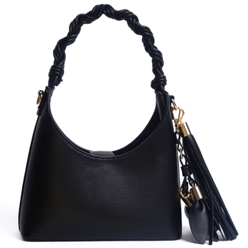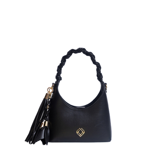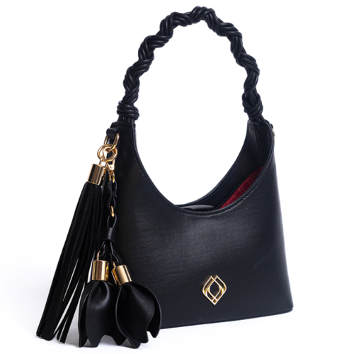 De Trashious Quinty is een stijlvolle handtas in zwart, afgewerkt met goudkleurige hardware. Het gevlochten hengsel geeft det as een verfijnde uitstraling, terwijl het gebruik van appelleer zorgt voor een duurzame en moderne look. Twee afneembare bag charms maken het ontwerp speels en uniek; een set tulpjes en een fringed detail, beide uitgevoerd in zwart appelleer met goudkleurige accenten.