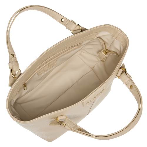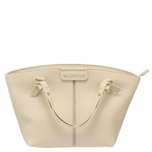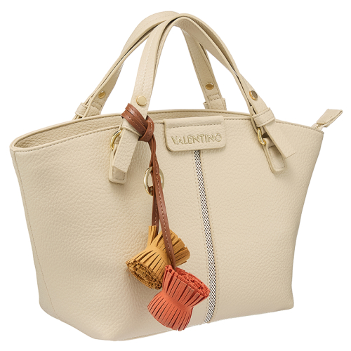 Als je op zoek bent naar een compacte handtas die zowel stijl als klasse uitstraalt, dan zit je goed met deze prachtige tas uit de Hybris Re collectie van Valentino Bags. Deze beige generfde shopper, gemaakt van imitatieleren materiaal, is een echte blikvanger. Het merk Valentino Bags, bekend om zijn Italiaanse flair en tijdloze elegantie, heeft wederom een meesterwerk afgeleverd. Het goudkleurige logo siert de voorkant van de tas, terwijl een verticale geblokte zwart-witte band een speelse touch toevoegt. Om het helemaal af te maken, hangen er twee schattige pompoentjes in cognac en roestbruin aan een van de hengsels. Deze handtas laat je gegarandeerd opvallen!