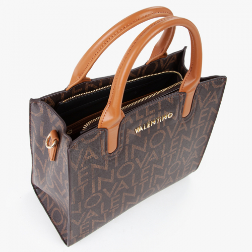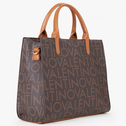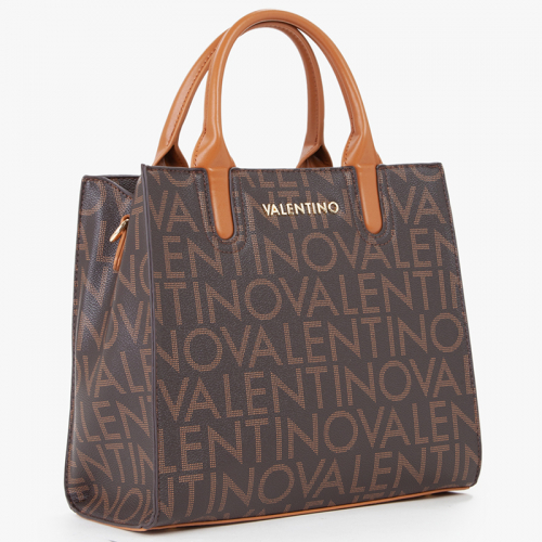 Met de Valentino Bags Regina Re handtas draag je moeiteloos een vleugje elegantie met je mee, waar je ook gaat. Het donkerbruine kunststof, subtiel voorzien van een lichtbruin logopatroon, wordt verfijnd aangevuld met goudkleurige hardware die de tas een luxueuze uitstraling geeft. Op de voorzijde prijkt het merklogo in metaal, een opvallend detail dat deze tas meteen herkenbaar maakt als een meesterwerk van Valentino Bags.