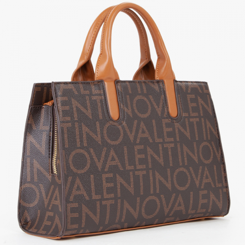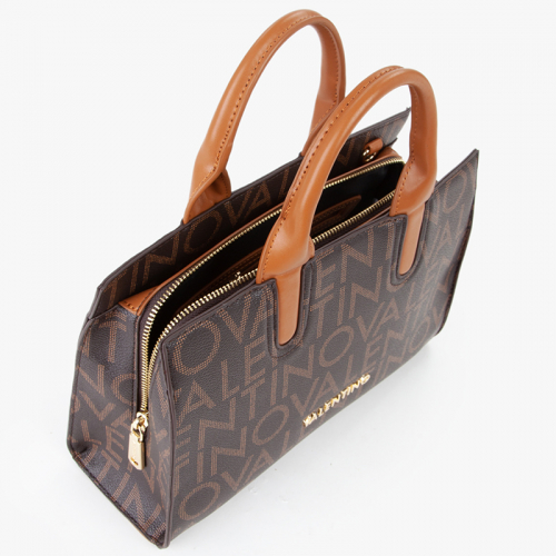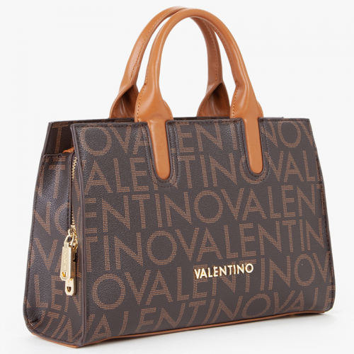 De Valentino Bags Regina Re straalt luxe uit met een all-over logo print op een donkerbruine achtergrond en cognackleurige logo's. De goudkleurige hardware, waaronder het opvallende logo aan de voorkant, geeft de tas een elegante finishing touch. De cognackleurige handvaten maken het geheel stijlvol en tijdloos.