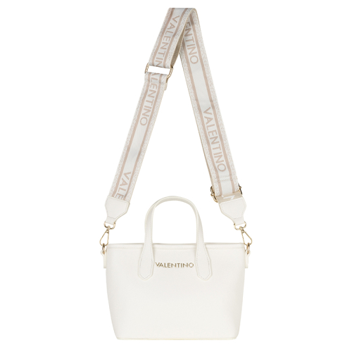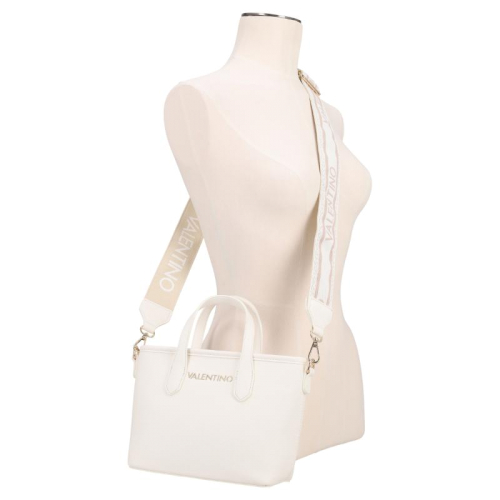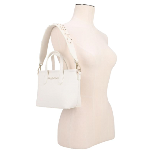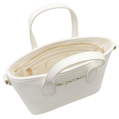Stap de wereld van verfijnde stijl binnen met de Valentino Bags Dea Re. Het strakke witte design vormt de perfecte basis voor de luxe goudkleurige hardware, die het geheel een elegante en krachtige uitstraling geeft. De generfde leerlook zorgt voor extra diepte en een hoogwaardige finish, terwijl de merknaam op de voorzijde direct verwijst naar het iconische karakter van Valentino Bags. Een bijzonder detail is de korte schouderband met kunststof merkletters, afgewerkt met subtiele afgeronde goudkleurige studs voor een chique accent. De dubbele handvatten geven de tas een klassieke handtasuitstraling en maken het silhouet extra stijlvol.