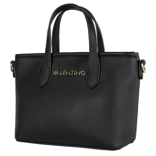 Stap de wereld van verfijnde stijl binnen met de Valentino Bags Dea Re. Het strakke zwarte design vormt de perfecte basis voor de luxe goudkleurige hardware, die het geheel een elegante en krachtige uitstraling geeft. De generfde leerlook zorgt voor extra diepte en een hoogwaardige finish, terwijl de merknaam op de voorzijde direct verwijst naar het iconische karakter van Valentino Bags. Een bijzonder detail is de korte schouderband met kunststof merkletters, afgewerkt met subtiele afgeronde goudkleurige studs voor een chique accent. De dubbele handvatten geven de tas een klassieke handtasuitstraling en maken het silhouet extra stijlvol.