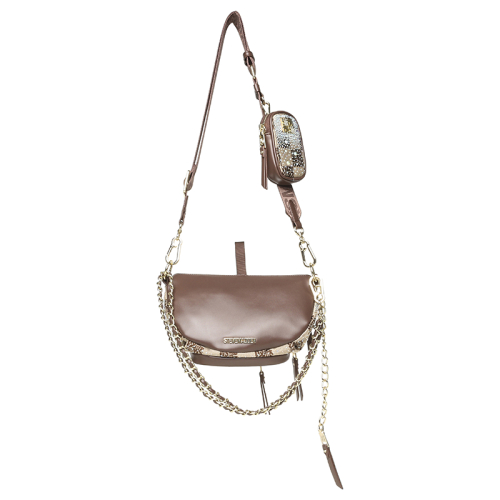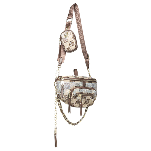 De Steve Madden Bmax12 is een trendy heuptasje met een beige-donkerbruine geruite print, waarbij de donkerbruine vierkantjes subtiel zijn opgebouwd uit Steve Madden-logootjes. De glimmertjes en goudkleurige hardware geven het geheel een luxe touch. De tas is afgewerkt met een bijpassende bag charm die fungeert als extra ritsvakje.