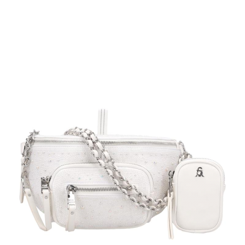 De Steve Madden Bmaximap is een opvallende heuptas in wit, rijkelijk versierd met glanzende steentjes in diverse groottes die een parelachtige glans geven. De tas is afgewerkt met zilverkleurige hardware en voorzien van een afneembare witte bag charm, die niet alleen een speels detail vormt maar ook fungeert als extra ritsvak.