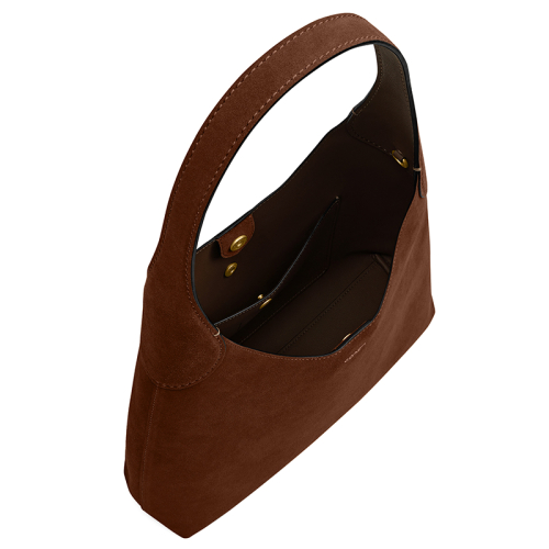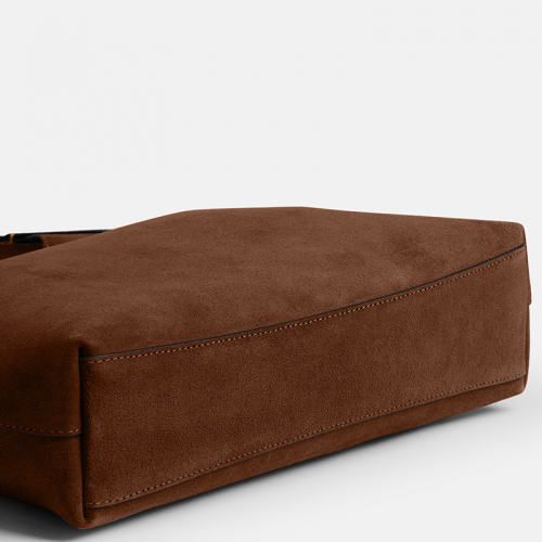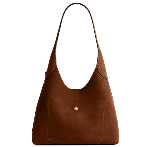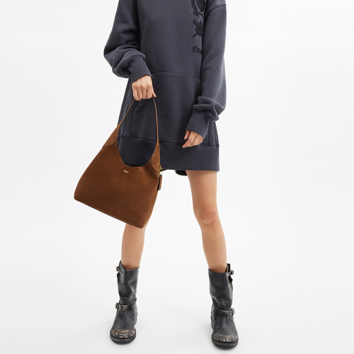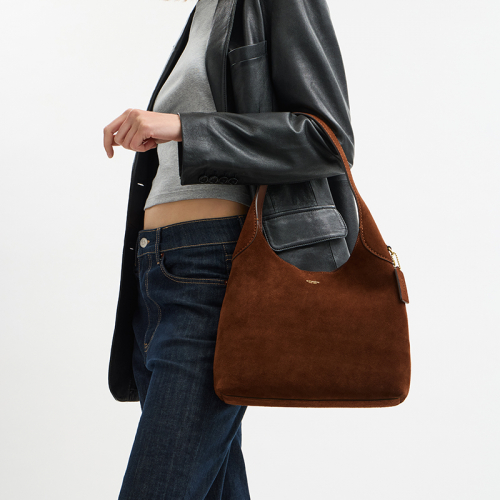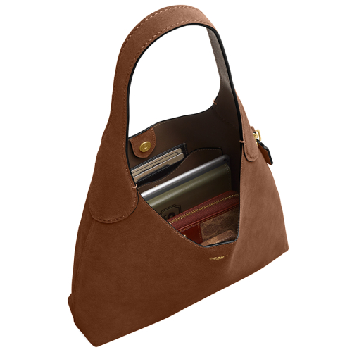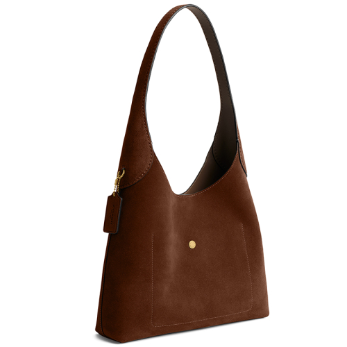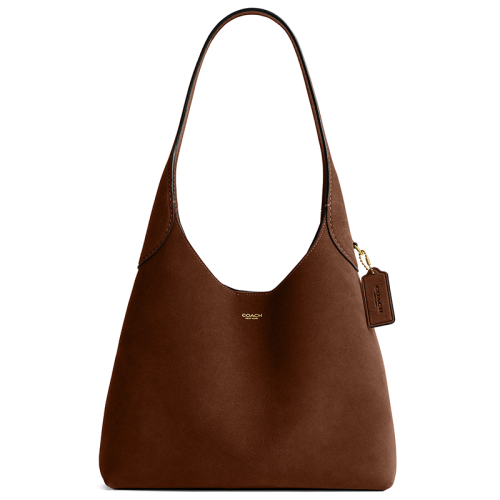 De Coach Brooklyn is een elegante schoudertas uitgevoerd in bruin suède. De tas is afgewerkt met goudkleurige hardware en heeft een subtiel logo in gouden letters op de voorkant. Aan dezijkant hangt een stijlvolle bag charm die het geheel een luxe uitstraling geeft.