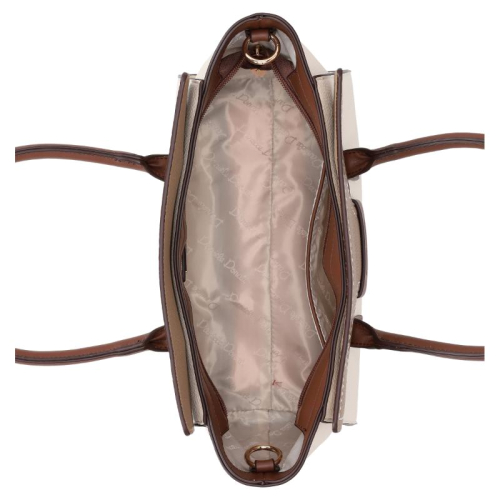 De Daniele Donati Zola handtas is een stijlvolle accessoire die elegantie met functionaliteit combineert. Met zijn warme off-white en beige kleuren, afgewerkt met bruine details en goudkleurige hardware, is deze tas een echte blikvanger.