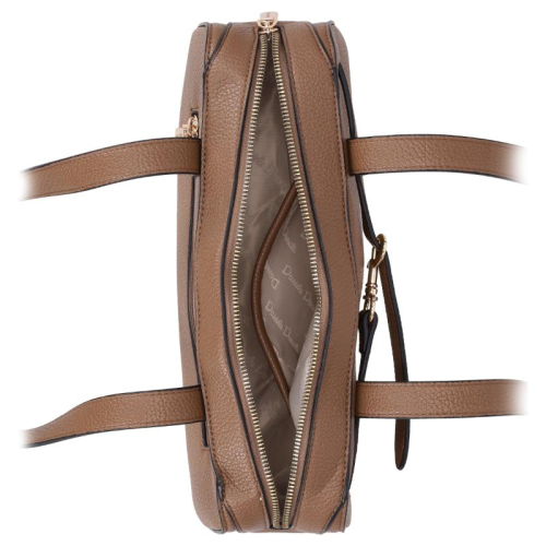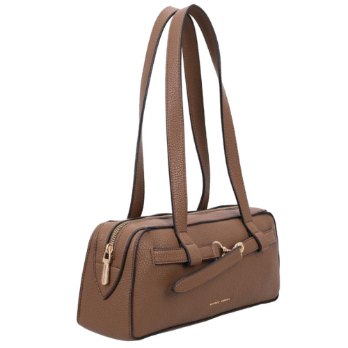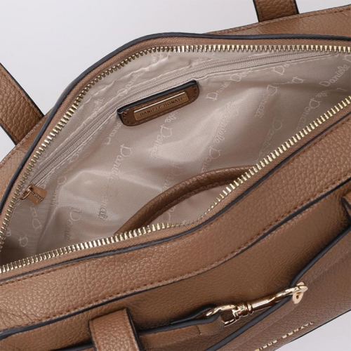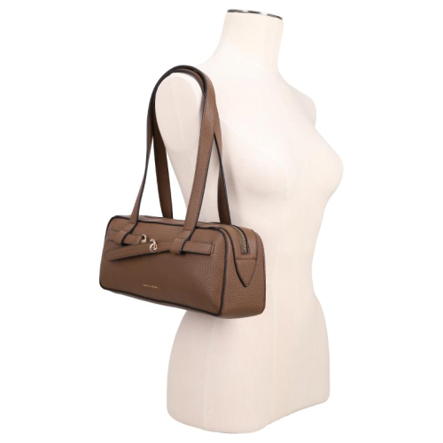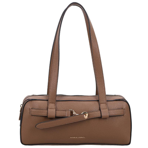 De Daniele Donati schoudertas is uitgevoerd in klassiek taupe en afgewerkt met goudkleurige hardware. Het ontwerp is langwerpig in de breedte, waardoor de tas een moderne en elegante uitstraling krijgt. De subtiele buckle en de zwarte naden versterken het verfijde karakter.