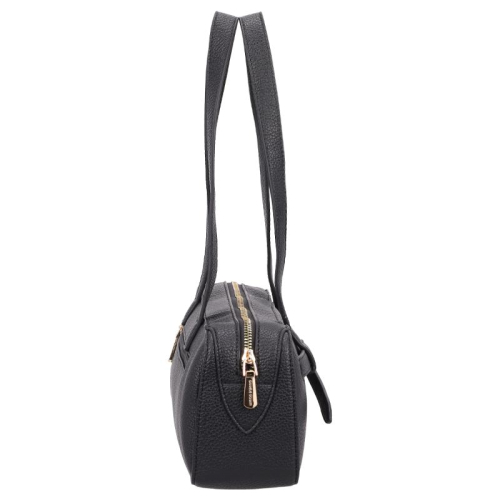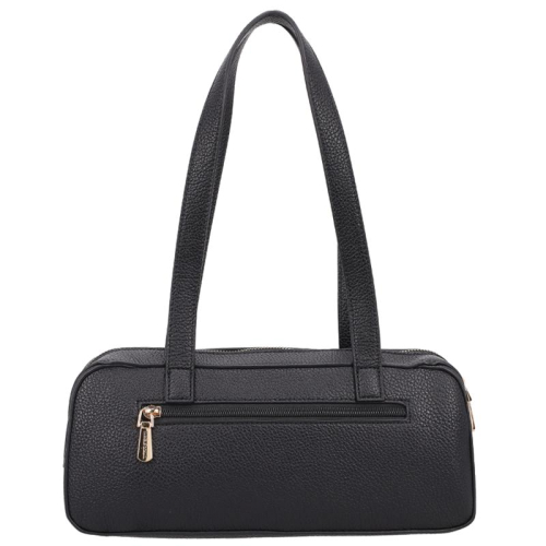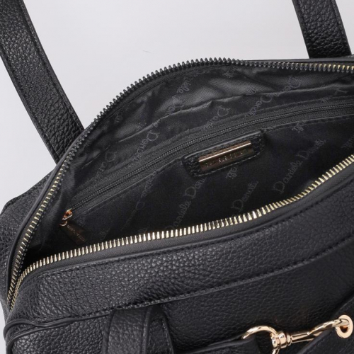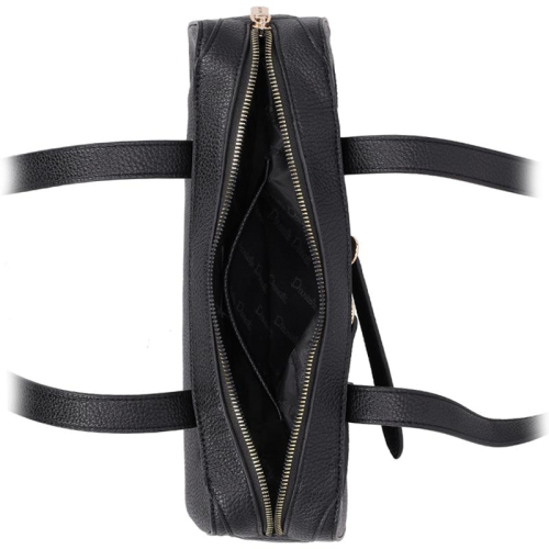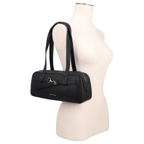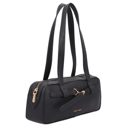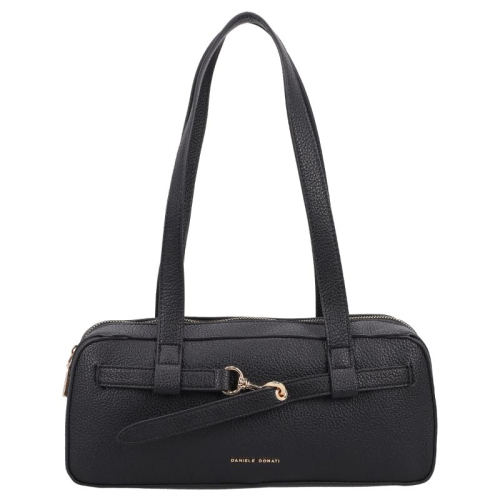 De Daniele Donati schoudertas is uitgevoerd in klassiek zwart en afgewerkt met goudkleurige hardware. Het ontwerp is langwerpig in de breedte, waardoor de tas een moderne en elegante uitstraling krijgt. De subtiele buckle en de zwarte naden versterken het verfijde karakter.