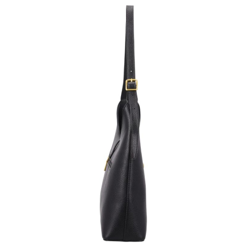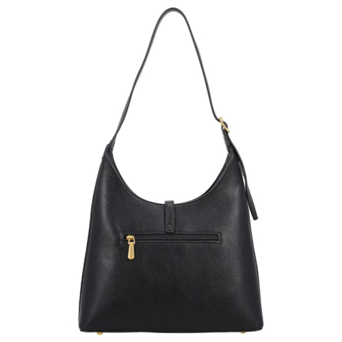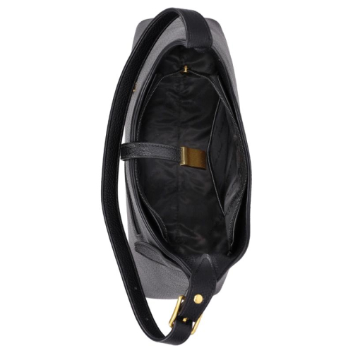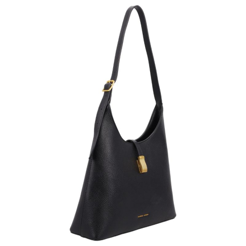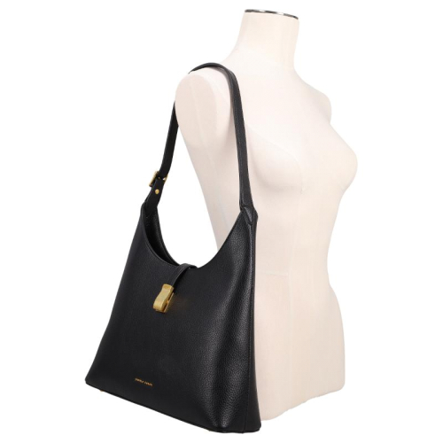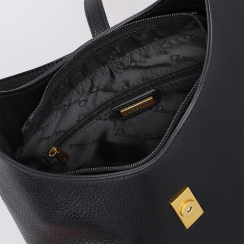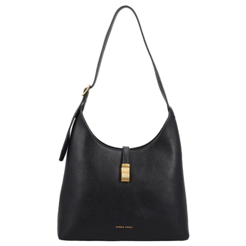 De Daniele Donati schoudertas is uitgevoerd in klassiek zwart en afgewerkt met goudkleurige hardware. De tas heeeft een elegante buckle met een magnetische drukknoopsluiting die de voor- en achterzijde stijlvol bij elkaar houdt. Dankzij de steunpootjes aan de onderkant blijft de tas stevig staan en wordt het materiaal goed beschermd.