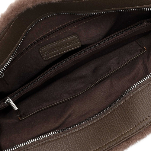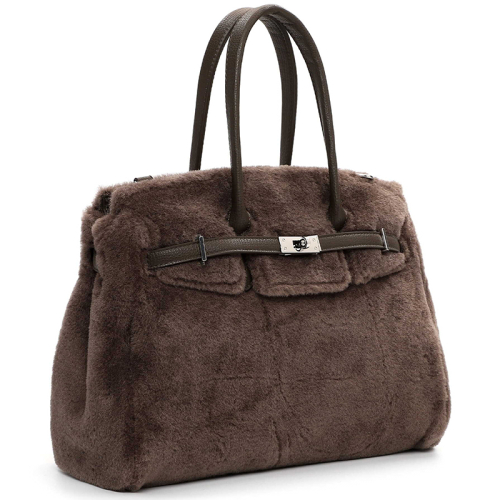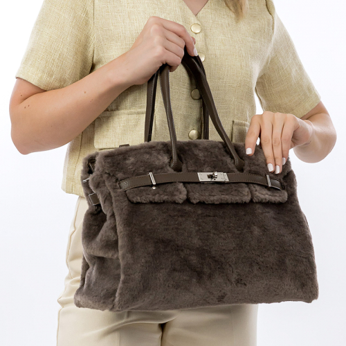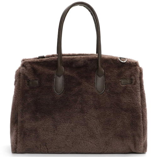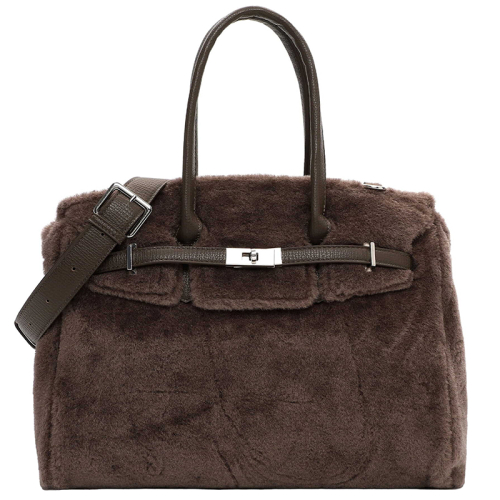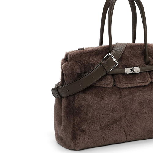 De tas heeft een luxueuze imitatiebont afwerking die zacht aanvoelt en visueel opvalt. Aan de voorkant prijkt een zilverkleurige buckle, omlijst door imitatieleren details zoals een leren strookje en stevige handvaten. Een elegante mix van materialen die zorgt voor een rijke, gelaagde uitstraling.