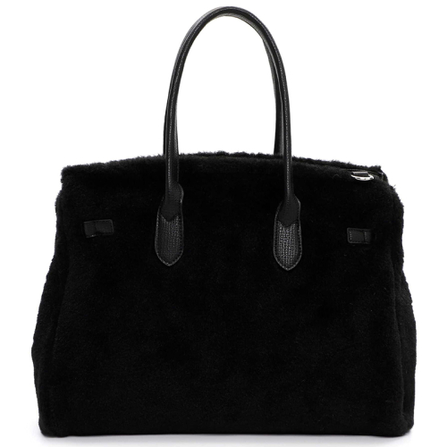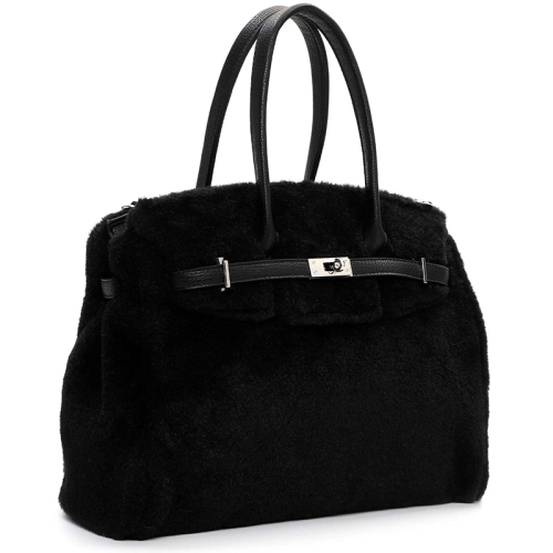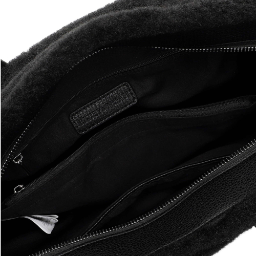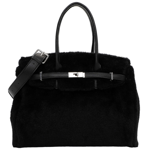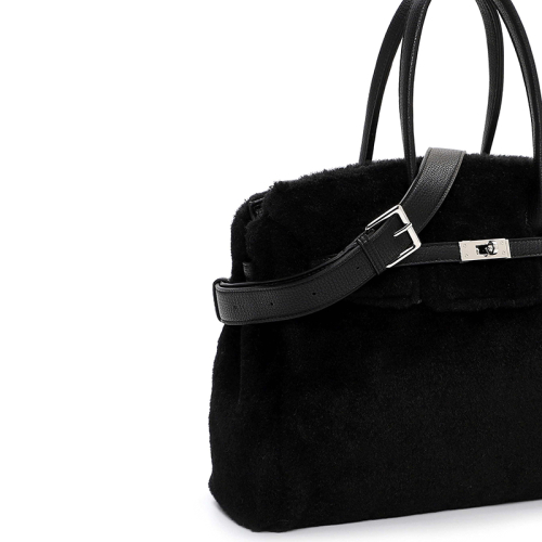 De tas heeft een luxueuze imitatiebont afwerking die zacht aanvoelt en visueel opvalt. Aan de voorkant prijkt een zilverkleurige buckle, omlijst door imitatieleren details zoals een leren strookje en stevige handvaten. Een elegante mix van materialen die zorgt voor een rijke, gelaagde uitstraling.