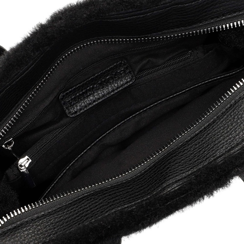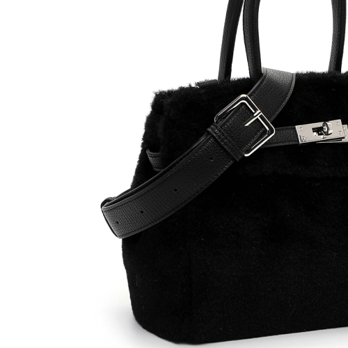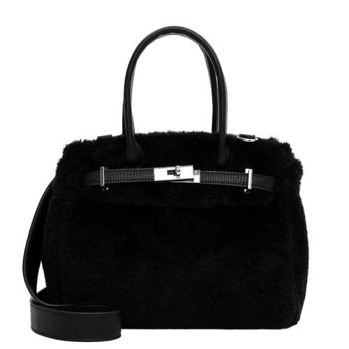 De tas is uitgevoerd in een luxueuze imitatiebont look die zacht aanvoelt en direct in het oog springt. Aan de voorkant siert een zilverkleurige buckle het ontwerp, omlijst door imitatieleren details zoals een verfijnd leren strookje en stevige handvaten. De combinatie van materialen zorgt voor een rijke, gelaagde uitstraling met een moderne twist.