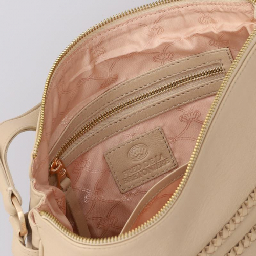 Dit is niet zomaar een tas, het is de Fred De La Bretoniere Valera crossbodytas, een statement piece in je garderobe. Deze taupe schoonheid met verfijnde gevlochten details voorop en glanzende goudkleurige hardware straalt pure elegantie uit. Het merklogo prijkt trots op de voorkant, een subtiele hint naar de rijke historie van het merk Fred De La Bretoniere, dat bekend staat om zijn vakmanschap en stijlvolle ontwerpen. Dit iconische merk heeft zijn roots in Nederland en heeft zich gevestigd als een pionier in de wereld van luxe accessoires.