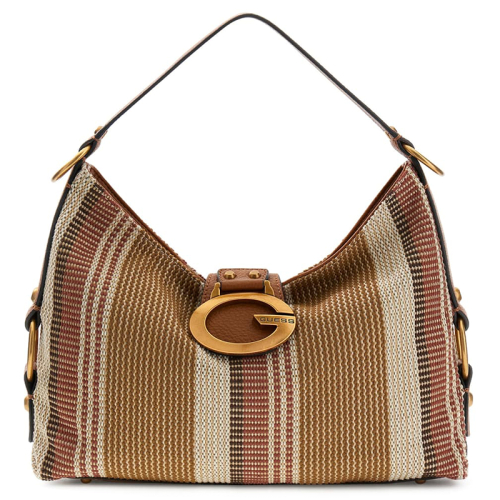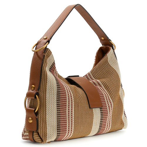 Deze zomerse Guess Camden schoudertas met cognac en ecru strepen is de perfecte accessoire voor een zonnige dag.
