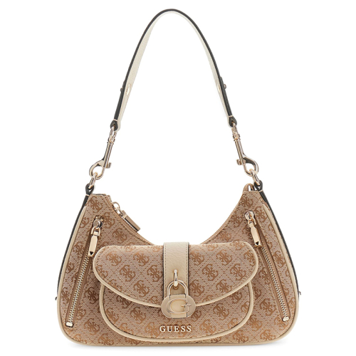 De Guess Jessa schoudertas is een echte blikvanger die je look moeiteloos naar een hoger niveau tilt. De warme bruine logoprint straalt direct herkenbare klasse uit en laat zien dat stijl in de details zit. Guess, met zijn roots in de Verenigde Staten en wereldwijd geliefd om zijn modieuze uitstraling, weet ook met dit ontwerp weer te verrassen. De goudkleurige hardware geeft de tas een luxe finishing touch, terwijl de beige kunstleren accenten zorgen voor een verfijnde balans, en aan de voorzijde hangt een decoratief slotje dat het geheel extra elegant maakt.
