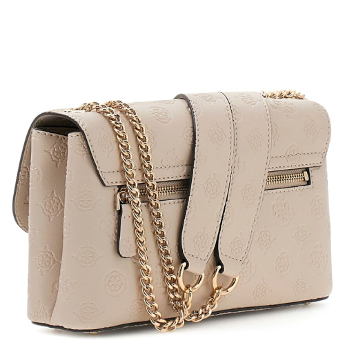 Stijlvol, elegant en een tikje gedurfd, dat is de Guess Dita schoudertas. Deze tas combineert een classy uitstraling met een praktische afmeting. Gemaakt van taupe kunststof met een klassiek logopatroon, straalt deze tas een tijdloze charme uit. Het merk Guess, bekend om zijn trendy en iconische ontwerpen, heeft zijn roots in de Verenigde Staten en staat hoog aangeschreven in de modewereld. De tas is afgewerkt met goudkleurige hardware, een chic Guess logo op de voorzijde en een stoere metalen chain schouderband die elke outfit naar een hoger niveau tilt.