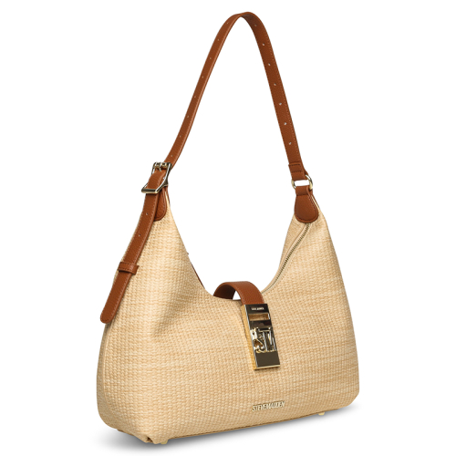 De Steve Madden BovieS schoudertas in elegant beige is een must-have voor iedere fashionista die houdt van stijl en functionaliteit. Met zijn verfijnde geweven textuurpatroon en chique goudkleurige details is dit dé tas om een statement te maken!