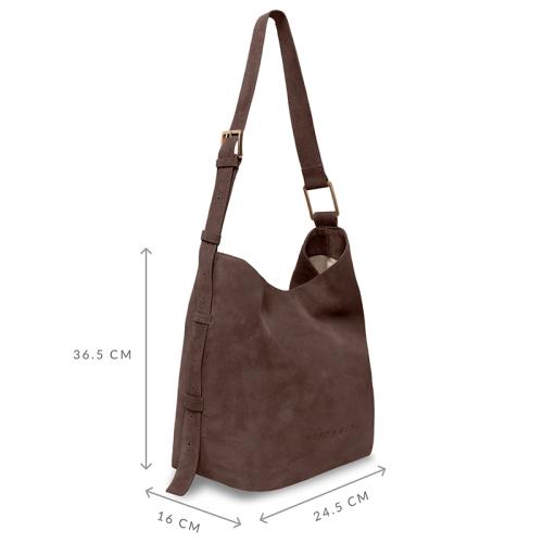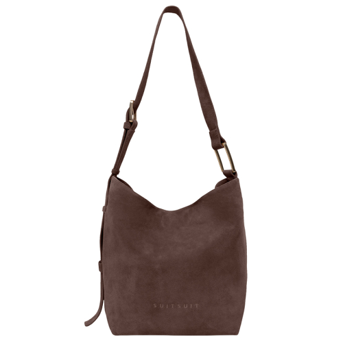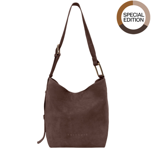 De SUITSUIT Fab Seventies Special Edition is een stijlvolle schoudertas uitgevoerd in bruin suède. De tas is afgewerkt met goudkleurige details en voorzien van een subtiel geëmbossed logo op de voorkant, wat zorgt voor een luxe en tijdloze uitstraling.