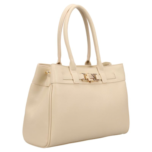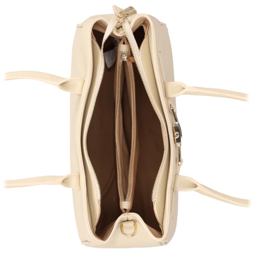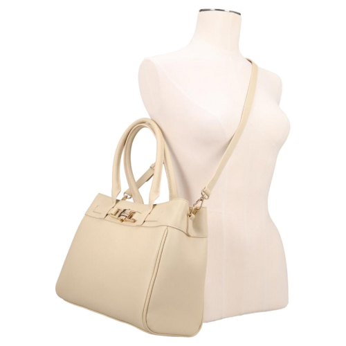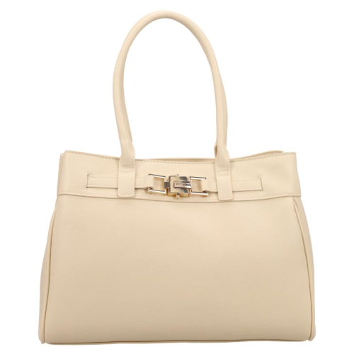 De Valentino Bags Alina Re is een elegante handtas uitgevoerd in beige en afgewerkt met goudkleurige hardware. De buckle aan de voorkant, eveneens in goudkleur, geeft de tas een luxe en moderne uitstraling. Het tijdloze design maakt dit model een stijlvolle toevoeging aan iedere garderobe.