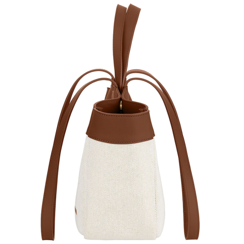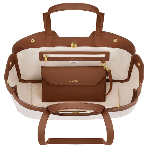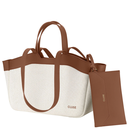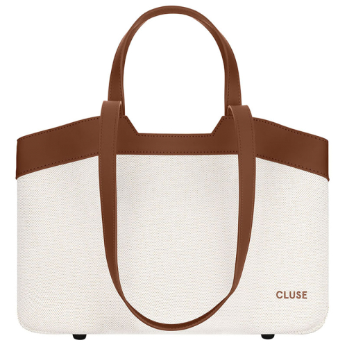 Nieuw! De stijlvolle Cluse Tote Bag Petite: een beige waterafstotend canvas met luxe bruine PU-details, nu in een kleiner jasje en perfect voor elke dag!