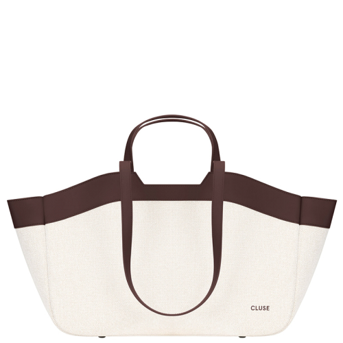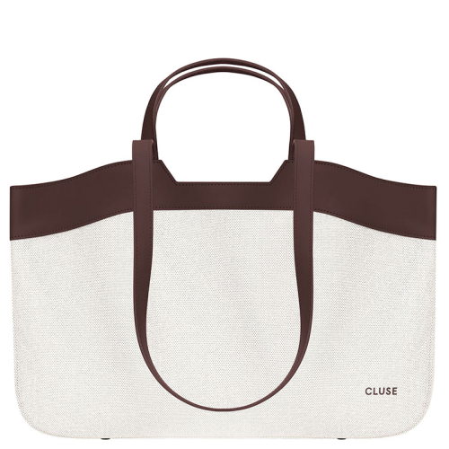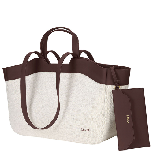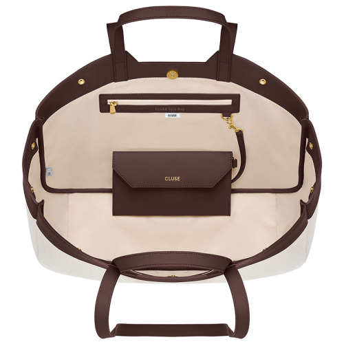 Nieuw! De stijlvolle Cluse Tote Bag: een beige waterafstotend canvas met luxe bruine PU-details, perfect voor dagelijkse shopping!