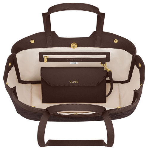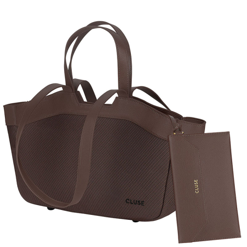 Nieuw! De stijlvolle Cluse Tote Bag Petite: een bruin waterafstotend canvas met luxe PU-details, nu in een kleiner jasje en perfect voor elke dag!