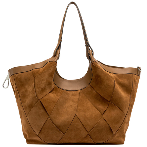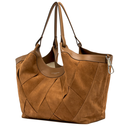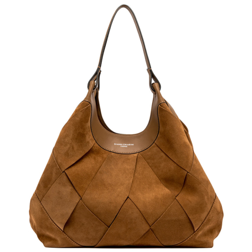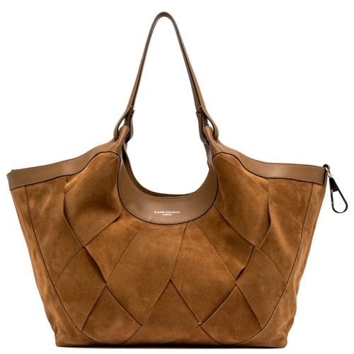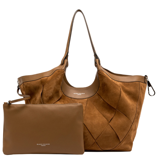 De Gianni Chiarini Dua is een stijlvolle shopper in bruin suède, afgewerkt met zilverkleurige hardware. De bovenranden zijn versterkt met gehamerd leer, wat zorgt voor een subtiele textuur en extra stevigheid. Een verfijnde tas met een natuurlijke, luxe uitstraling.