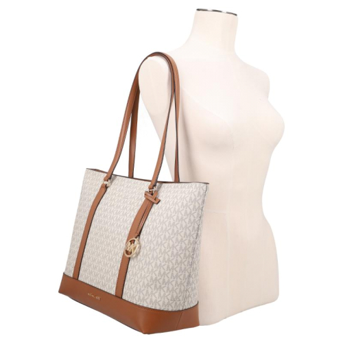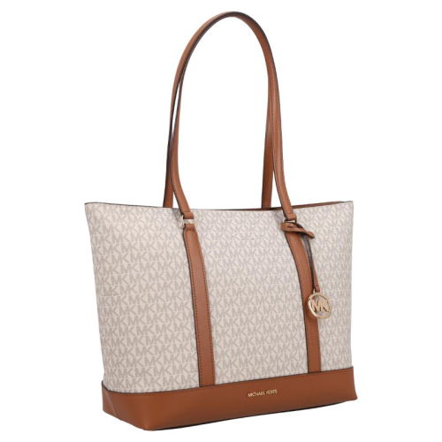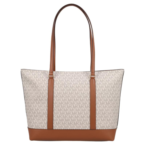 Maak kennis met de elegante Michael Kors Andie shopper in een stijlvolle beige kleur met logopatroon en bruine kunstleren details. Deze tas, met zijn luxueuze uitstraling en praktische indeling, is de perfecte metgezel voor elke fashionista onderweg!