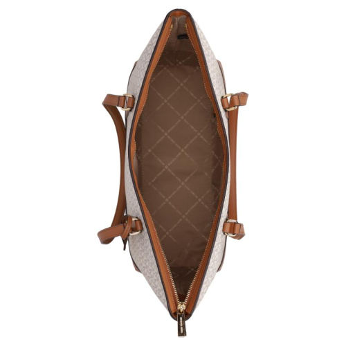 Michael Kors weet ons steeds weer te verrassen, en de Andie shopper is daarop geen uitzondering. Het stijlvolle beigekleurige logopatroon, gecombineerd met bruine kunstleren details, voegt een vleugje luxe toe aan elke outfit. De warme tinten van de tas worden perfect gecomplementeerd door de goudkleurige hardware. Als kers op de taart hangt er een opvallende Michael Kors bag charm aan de tas. Michael Kors, met zijn roots in Amerika, staat bekend als een merk dat luxe en toegankelijkheid perfect weet te combineren.