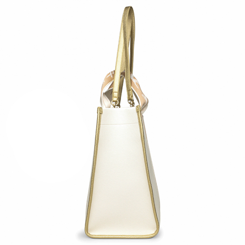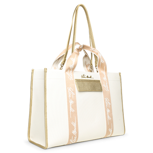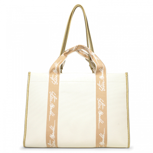 De Steve Madden Bdomino is een stijlvolle witte schoudertas met beige details en goudkleurige hardware. Het subtiel geëmbossede logo op de voorkant en het kleine gouden klepje met steekvak geven de tas een moderne, speelse uitstraling.