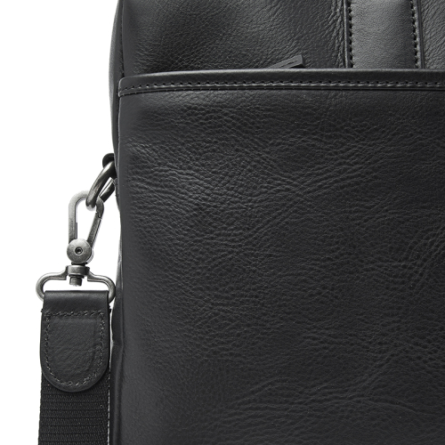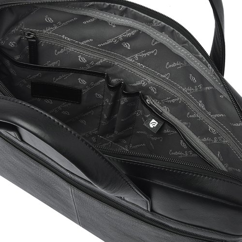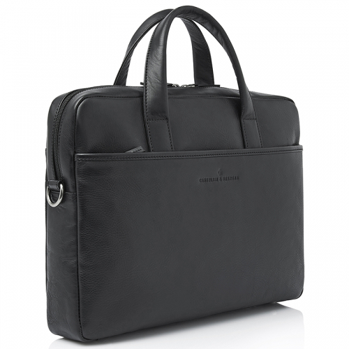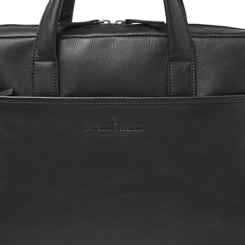 Ontdek de stoere Castelijn en Beerens laptoptas in het zwart, vervaardigd uit duurzaam gelooid leer volgens de richtlijnen van de Leather Working Group. De zichtbare natuurlijke nerf in het leer en de donkerzilverkleurige hardware geven hem een robuuste uitstraling.